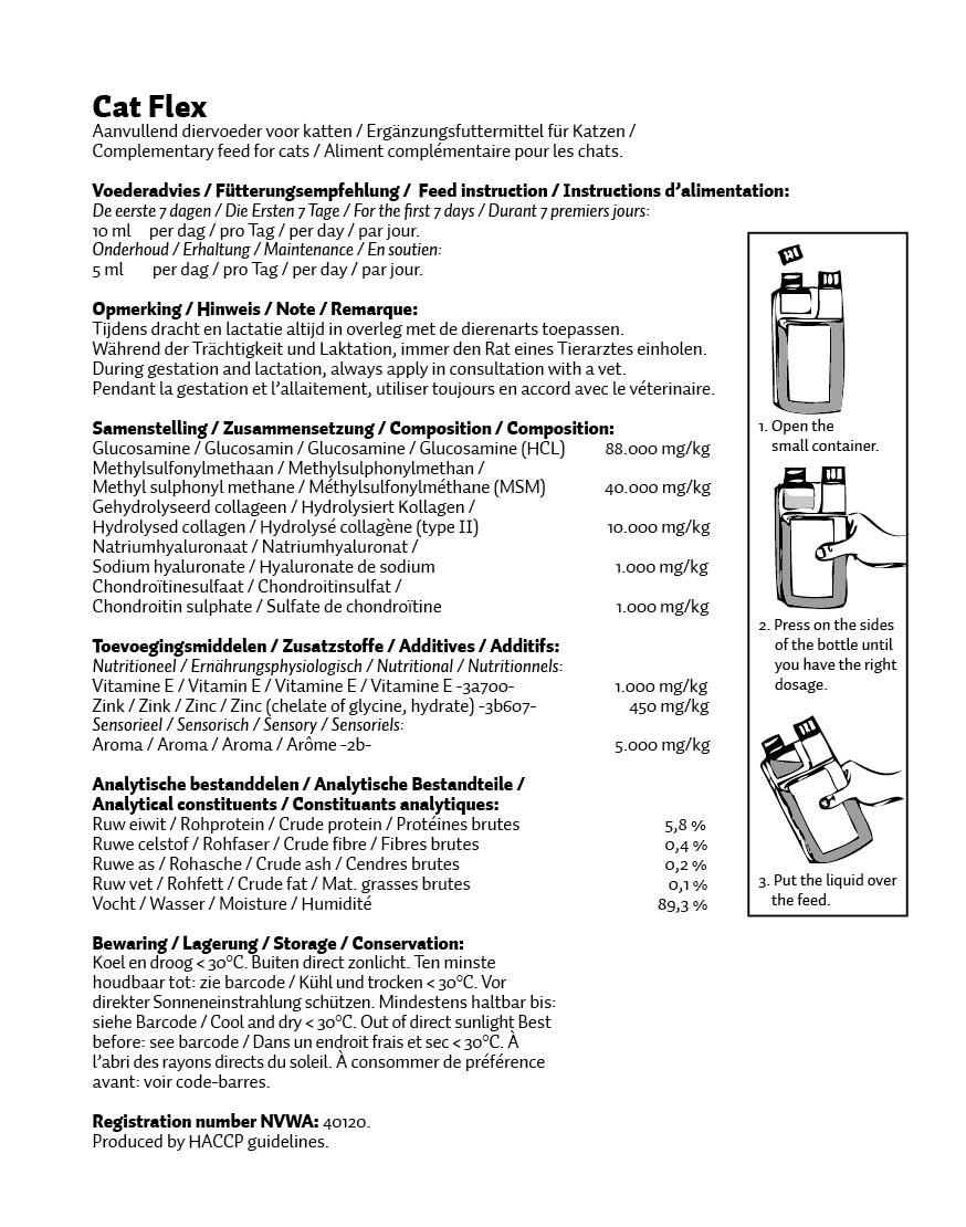Cat Flex bevat MSM, gehydrolyseerd Collageen type II, Glucosamine (HCL), Chondroïtinesulfaat, Vitamine C en lichaamseigen smeerstof Hyaluronzuur.