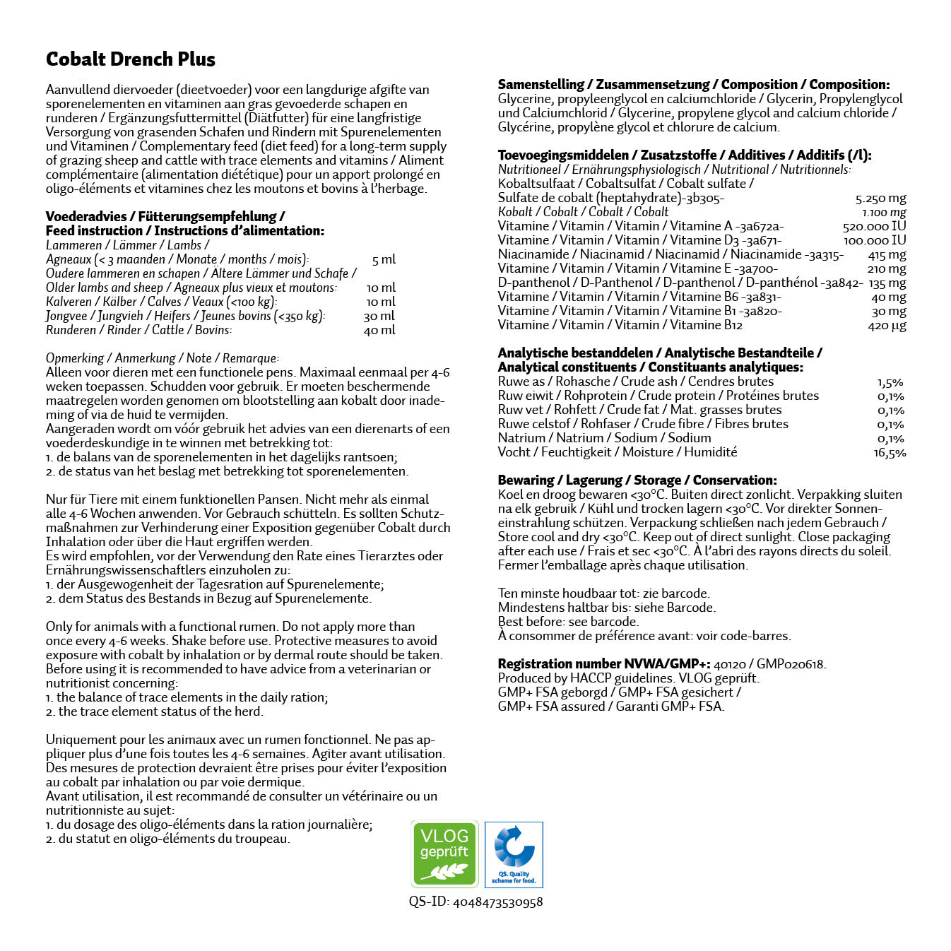 Aanvullend diervoeder voor schapen, lammeren, rundvee en kalveren. Kobaltverstrekking met een dekking van 2 tot 4 maanden. Bevat een combinatie van: kobalt, vitamine A, B1, B6, B12, D3, E en niacine.
