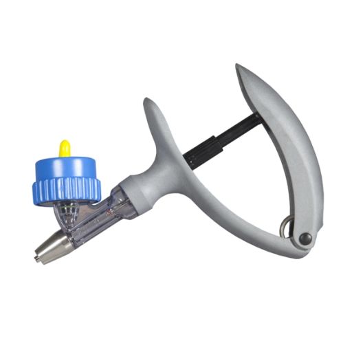 Eco-Matic spuit met een universele adapter set; de nieuw ontwikkelde adapter set is geschikt voor diverse flessen met verschillende afmetingen en vormen.
