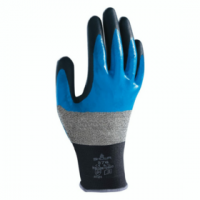 De SHOWA handschoen is voorzien van waterdichte3/4 blauwe nitril coating en biedt beschermingtegen oliën, water, schuurgevaar en lichte chemicaliën.